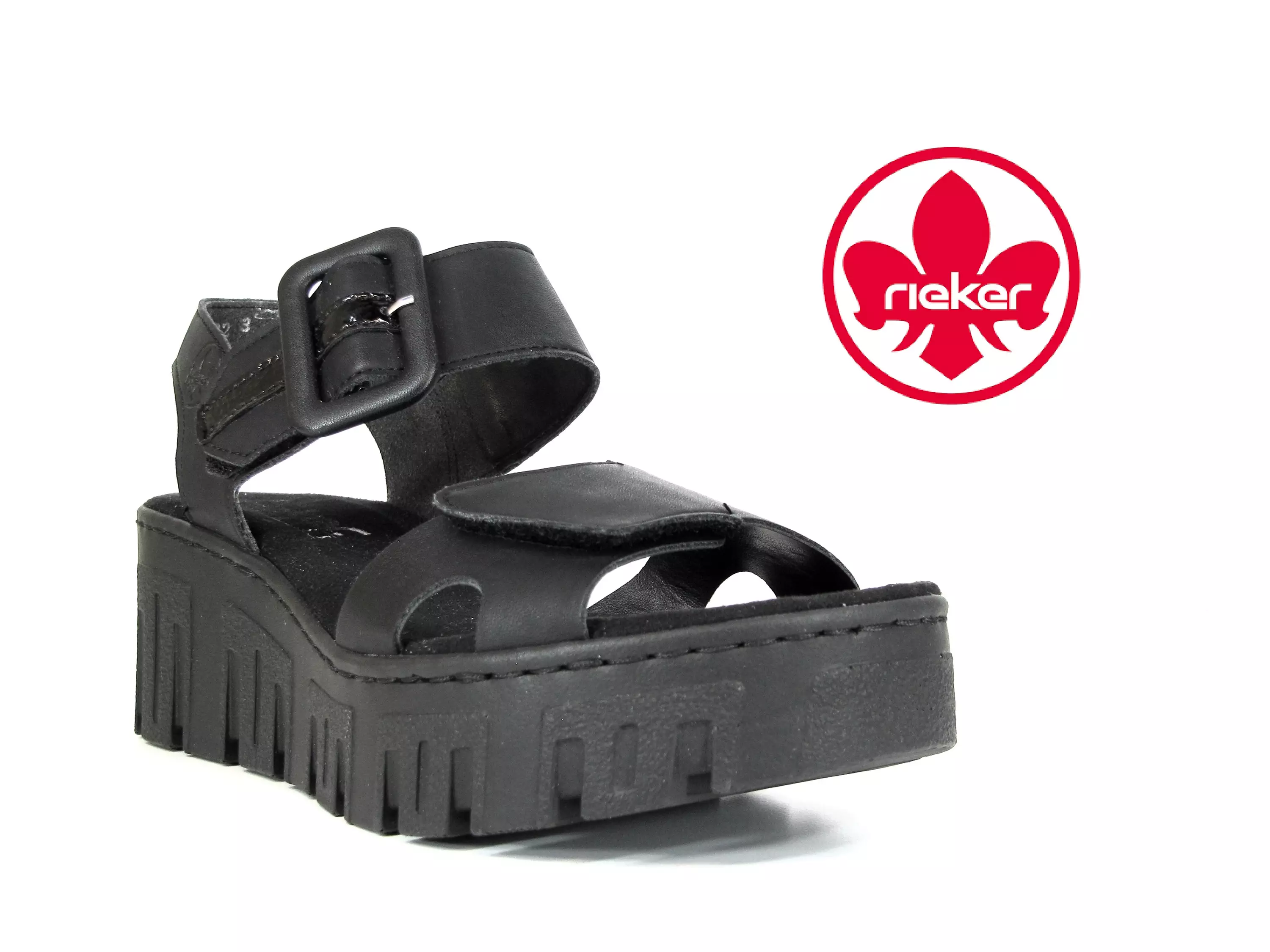 Riekerin tyylikäs paksupohjainen sandaali, jonka päälliosat on valmistettu laadukkasta ja helposti puhdistettavasta nahkajäljitelmästä. Edessä kaksi poikittain menevää remmiä, joiden avulla kenkä on helppo säätää juuri jalkaan sopivaksi. Lisäksi kengästä löytyy kantaremmi, joka autta kenkää pysymään tukevasti jalassa. Tekstiilipintainen AntiStress-pohjallinen on hyvin pehmustettu. Sandaalissa on kumisekoitteesta valmistettu kuvioitu pohja, jonka korkeus kannassa on n. 6cm ja päkiän kohdalla n. 3,5cm. Normaali lesti.
