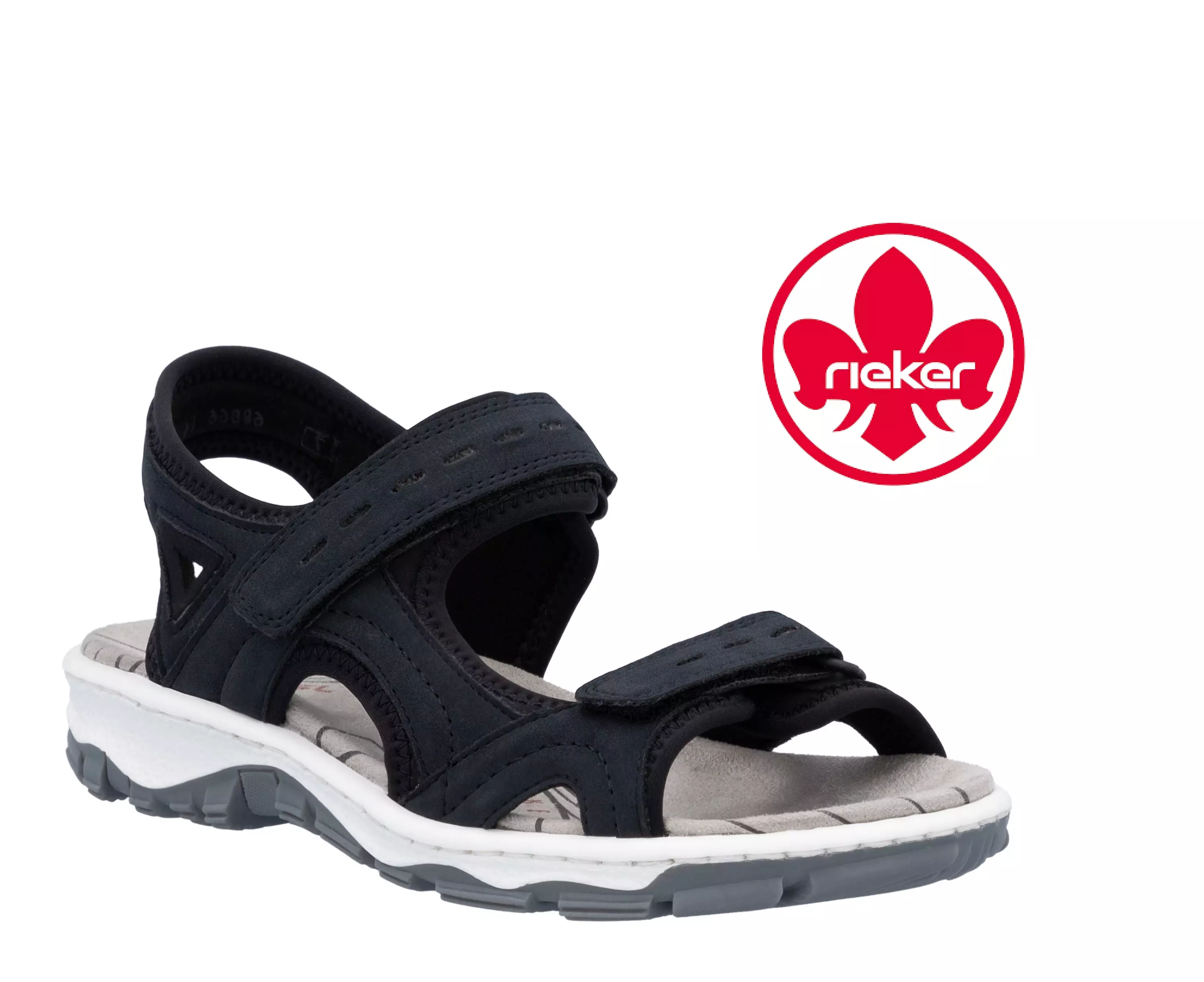 Riekerin sporttiset ja sirot sandaalit, joiden päälliosat on kestävästä nahkajäljitelmästä sekä pehmeästä tekstiilistä. Edessä kaksi tarraremmiä, jotka antavat sandaaliin hyvät säätömahdollisuudet. Remmien sisäpinnat ovat todella pehmeää ja hengittävää tekstiiliä. Tekstiilipintainen pohjallinen on kevyesti muotoiltu ja pehmustettu. Miellyttävän joustava ja taipuisa pohja on valmistettu pitävästä TR-kumista ja sen korkeus kannassa on n. 3cm.