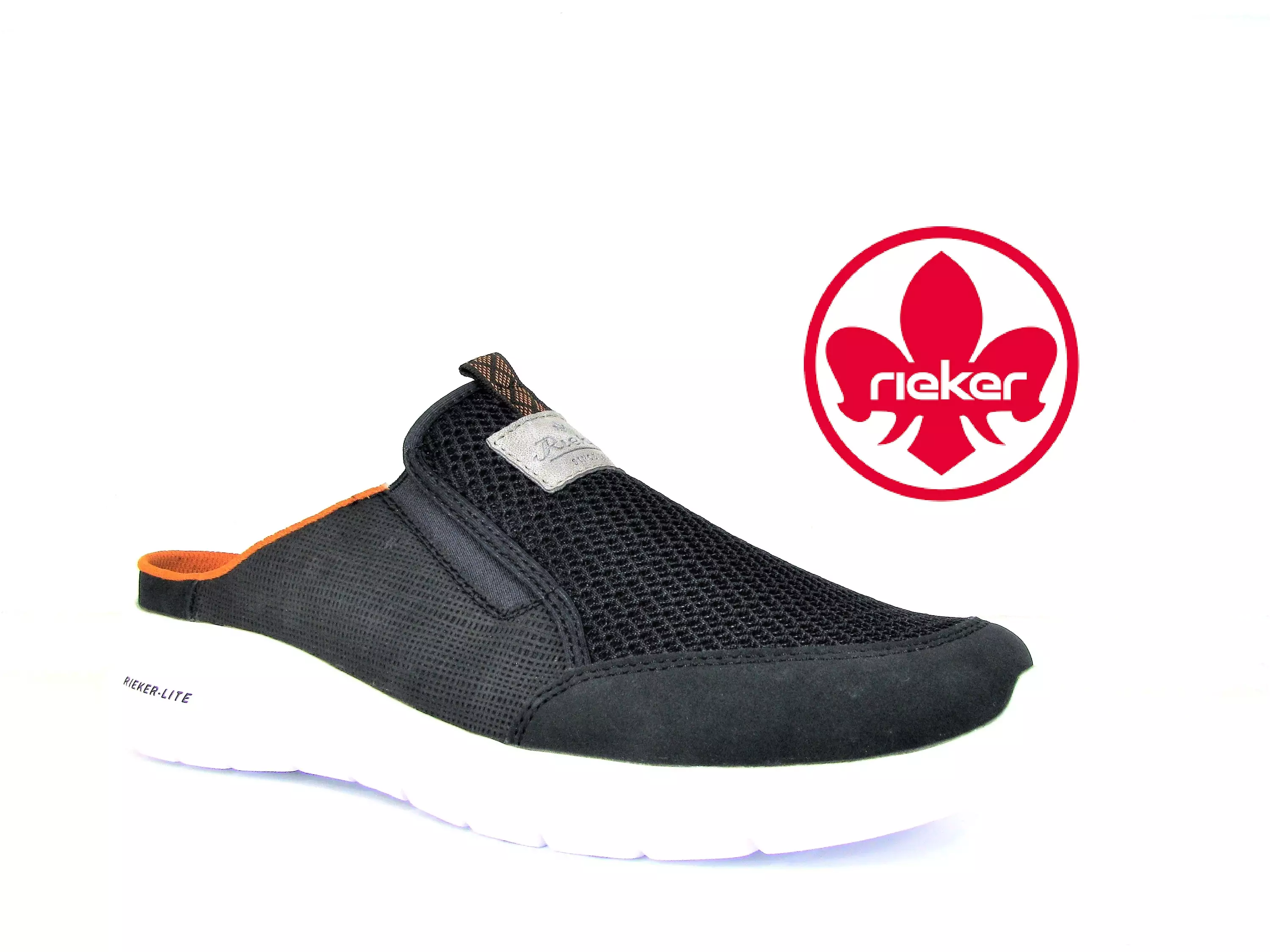 Riekerin todella kevyt umpikärkinen Rieker-lite pistokas. Päälliosat on valmistettu pehmeästä verkkotekstiilistä sekä nahkajäljitelmästä. Etuosan molemmin puolin olevat joustinosat tuovat jalkapöydän päälle tarvittaessa hieman lisätilaa. Pemustettu pohjallinen on päällystetty tekstiilillä. Kengässä on kuvioitu, tukeva mutta myös miellyttävän joustava ja taipuisa synteettisestä materiaalista valmistettu pohja. Pohjan korkeus kannassa on n. 4-4,5cm ja päkiän kohdalla n. 2,5cm.