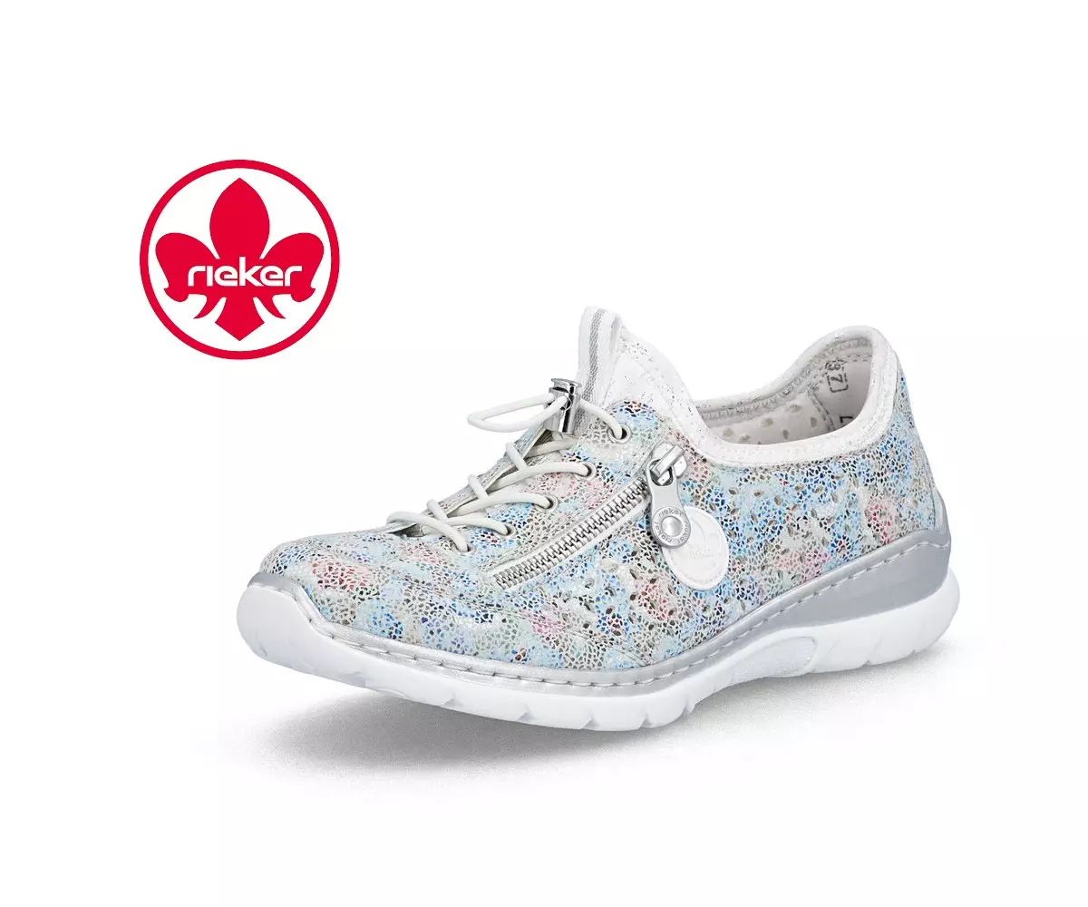 Riekerin kävelykengät, joiden päälliosat on valmistettu kauniisti kuvioidusta joustavasta tekstiilistä sekä kestävästä nahkajäljitelmästä. Edessä säädettävät joustinnauhat tuomassa jalkapöydän päälle säätövaraa. Etuosan ulkosyrjällä myös koristevetoketju. Sivuilla siroa rei'itystä, joka lisää kengän hengittävyyttä. Kengän sivua kiertää kaunis hopeanvärinen osio.