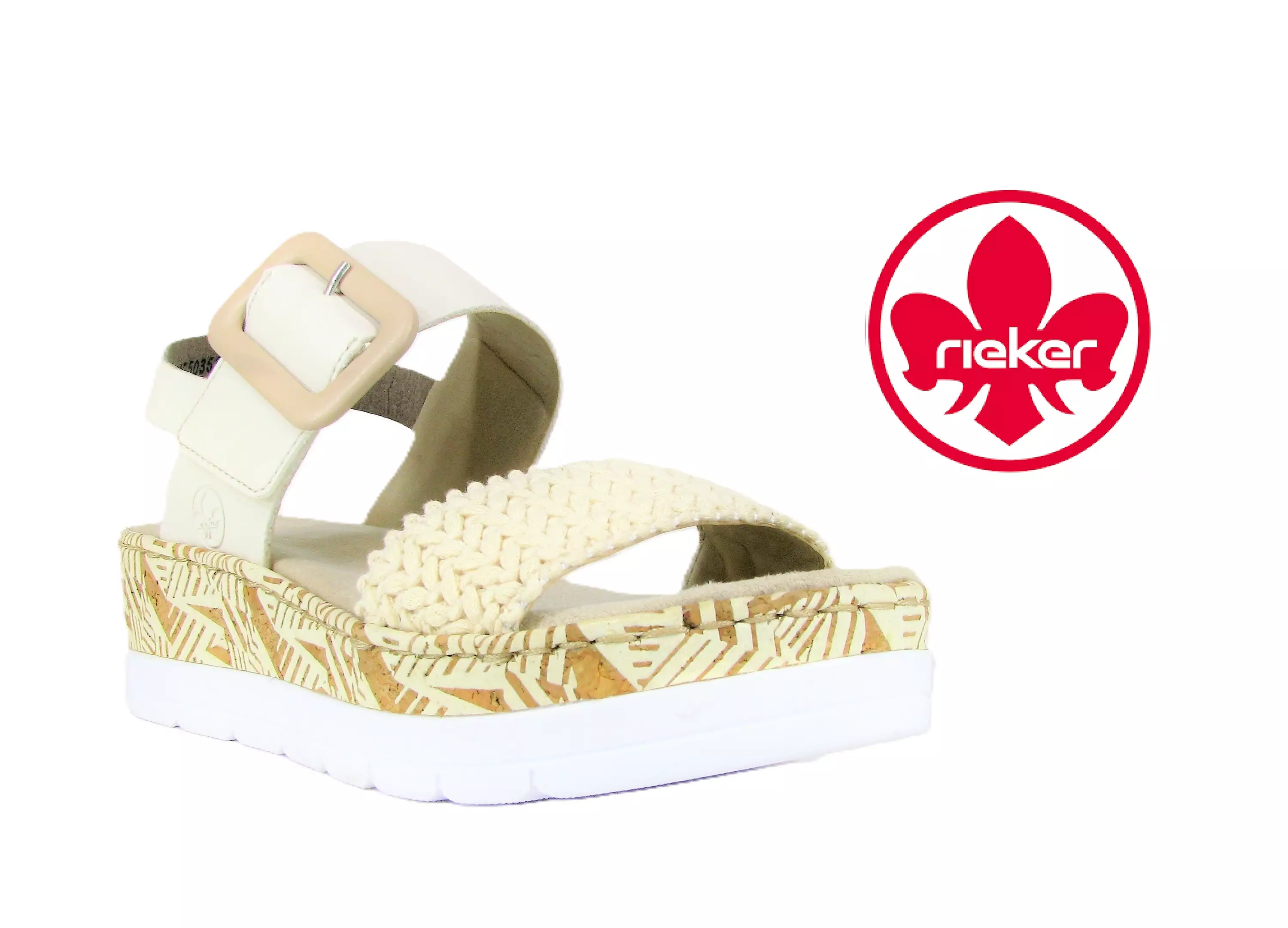 Riekerin tyylikäs sandaali paksuhkolla kiilamaisella pohjalla. Alimmassa remmissä kaunista neulosmaista kuviota, ja nahkajäljitelmästä valmistetussa tarrakiinnitteisessä yläremmissä koristesolki. AntiStress-pohjallinen on hyvin pehmustettu. Sandaalissa on pitävä, kumisekoitteesta valmistettu kuvioitu pohja, jonka korkeus kannassa n. 5cm ja päkiän kohdalla n. 3cm. Pohjan korkkimaisessa osassa on tyylikästä ja kulmikasta vaaleaa kuviointia.
