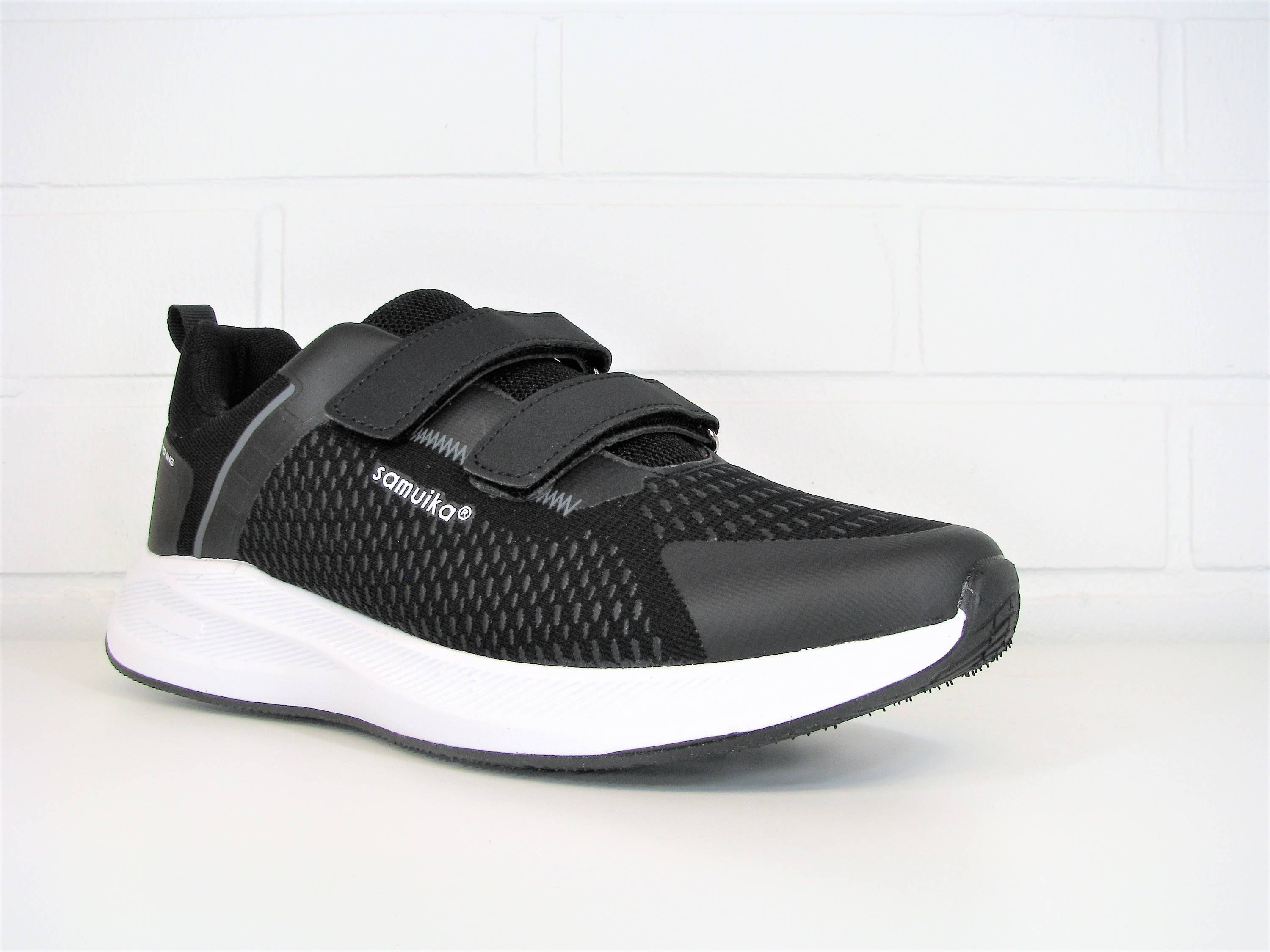 Samuikan kevyt, miellyttävän pehmeästä verkkoneuloksesta valmistettu tarralenkkari. Edessä kaksi helppokäyttöistä tarrakiinnitteistä remmiä, jotka mahdollistavat kengän suun laajan aukenemisen sekä hyvät säätömahdollisuudet. Myös sisäosat ovat jalan painon alla muotoutuvaa pohjallista myöten pehmeää ja hengittävää tekstiiliä. Kengässä on tukeva, kumisekoitteesta valmistettu kuvioitu pohja. Pohjan korkeus kannassa on n. 4cm ja päkiän kohdalla n. 2cm.