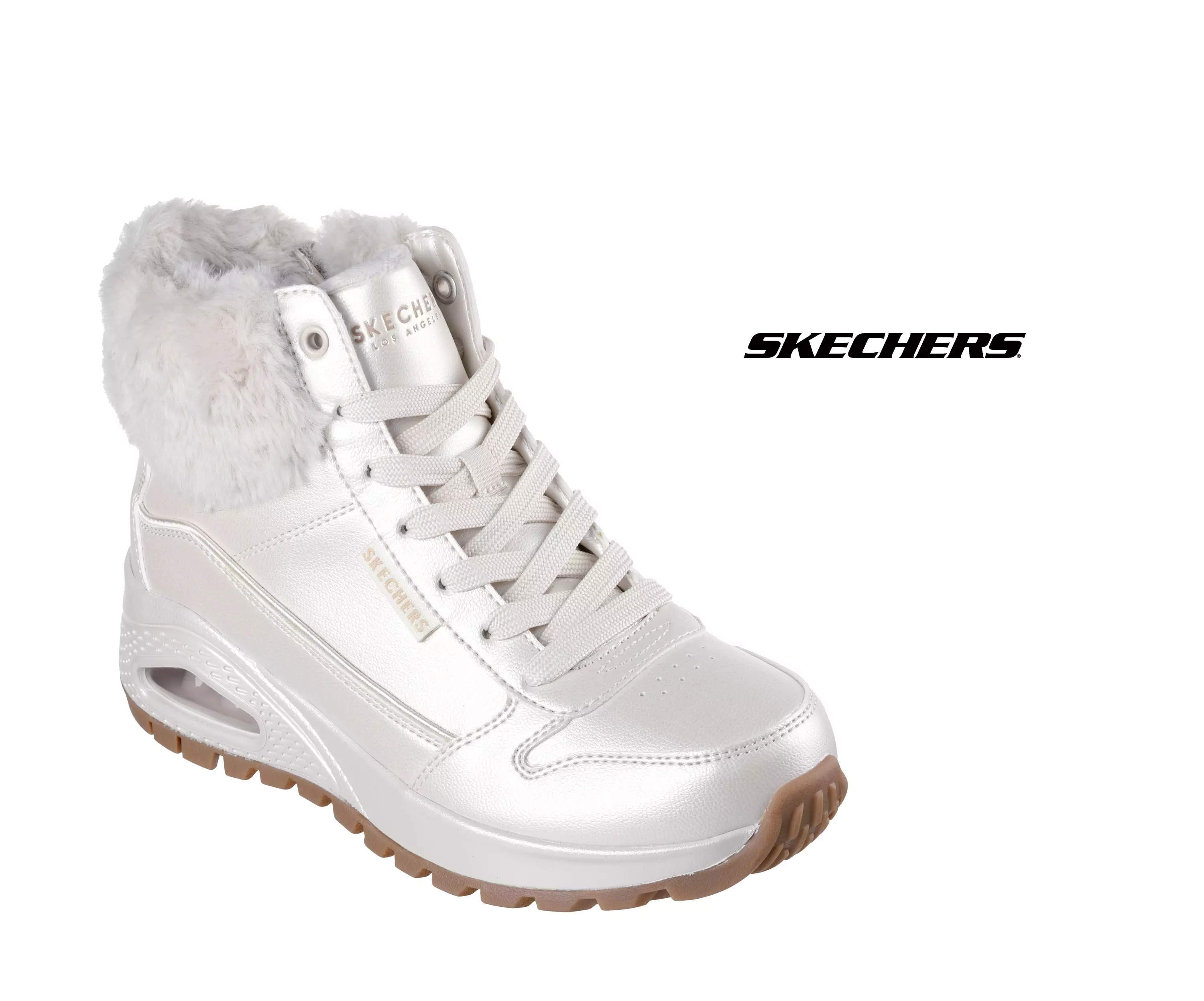 Skechersin trendikkäät Uno Rugged Galactic Heights talvikenkä, jonka pinta on valmistettu laadukkaasta synteettisestä nahkajäljitelmästä. Nilkan ympärillä tekoturkisreunus. Edessä nauhakiinnitys, jolla kengän saa säädettyä juuri jalkaan sopivaksi. Sisäsyrjällä vetoketju helpottamassa pukemista.