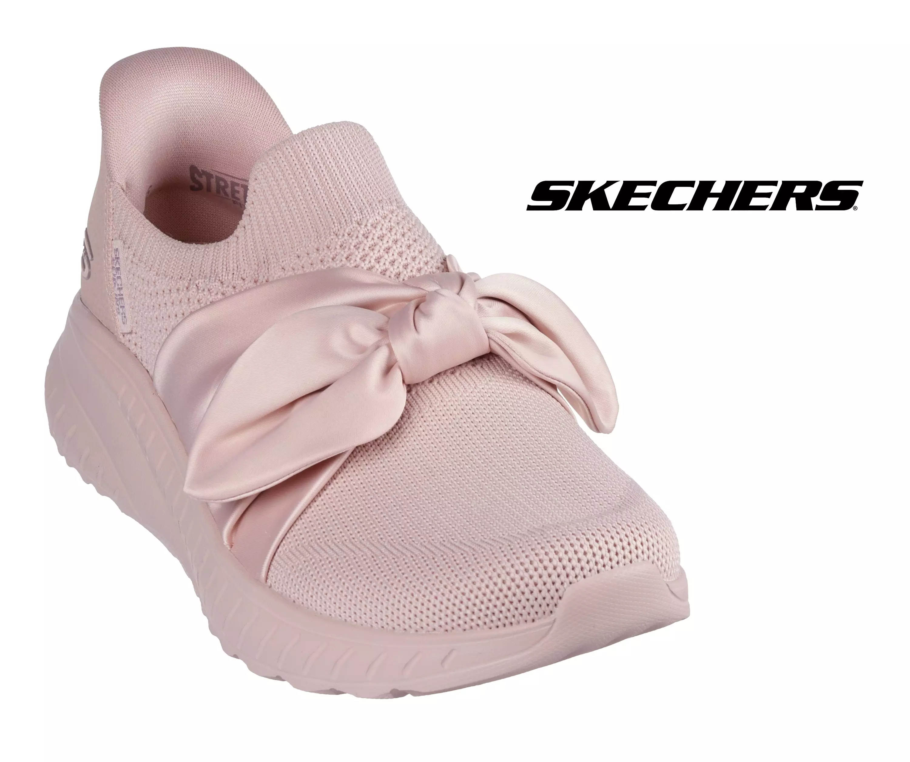 Skechersin ihanteellisen kevyet Slip-Ins Bobs Squad Chaos Inspire Away -sukkakengät, joiden päällinen on hengittävää ja mukavan pehmeää mesh-tekstiiliä. Etuosaa somistaa jalkapöydän päälle "solmittu", ompelupistoilla kiinnitetty satiinirusetti.