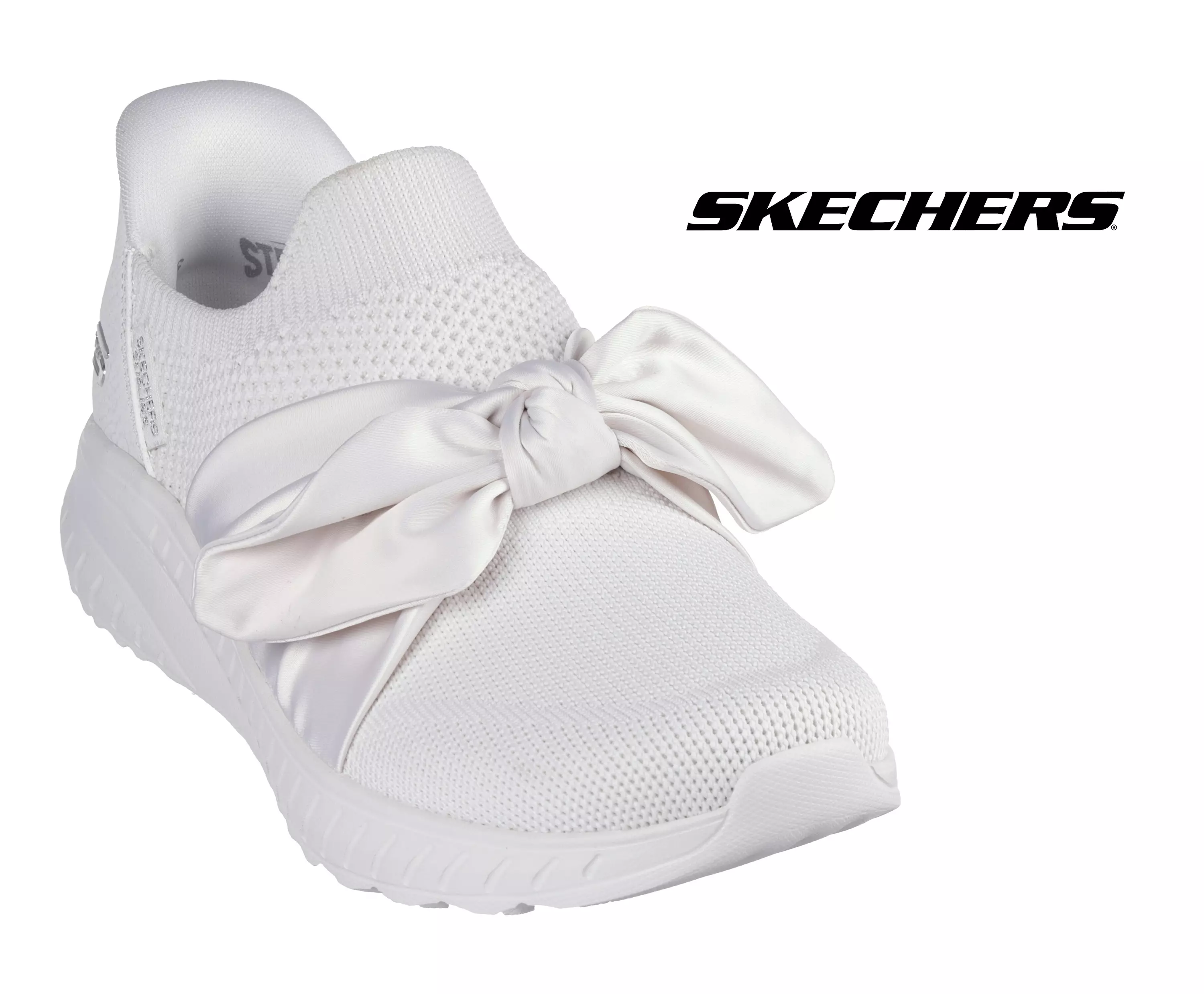 Skechersin ihanteellisen kevyet Slip-Ins Bobs Squad Chaos Inspire Away -sukkakengät, joiden päällinen on hengittävää ja mukavan pehmeää mesh-tekstiiliä. Etuosaa somistaa jalkapöydän päälle "solmittu", ompelupistoilla kiinnitetty satiinirusetti.