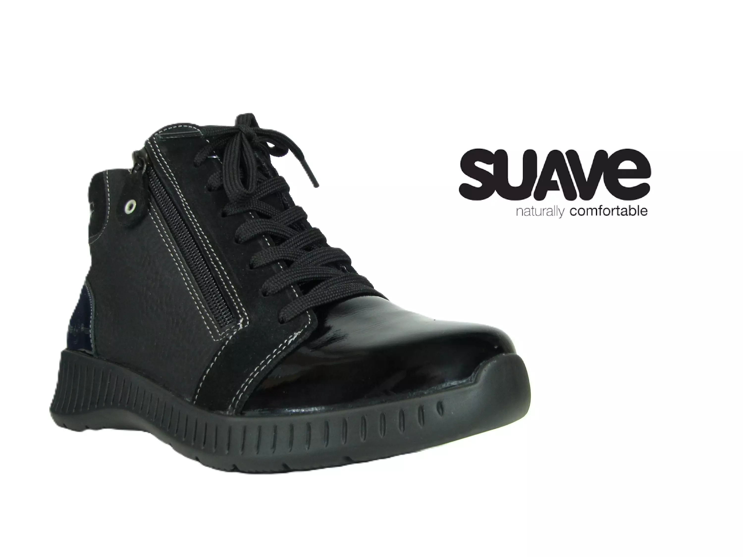 Suaven tilava Geneve-nilkkuri, jonka päälliosa on valmistettu aidosta ja laadukkaasta nahasta lakeeriosuuksia lukuunottamatta. Edessä nauhakiinnitys tuomassa kenkään hyvät säätömahdollisuudet. Päällisen ulkosyrjällä vetoketju, jonka avulla kengän saa helpommin puettua jalkaan. Kengän sisäosat ovat miellyttävän pehmeää, kevyttä mutta lämmintä huopamaista tekstiiliä, ja irrotettava pohjallinen on hyvin pehmustettu sekä anatomisesti muotoiltu. Air Function -ominaisuus aikaansaa ilman kiertämisen kantapään ja jalkapohjan välillä tehden kengästä hengittävän sekä nopeasti kuivuvan. Synteettisestä materiaalista valmistettu kevyesti kuvioitu ulkopohja on joustava, mutta samaan aikaan todella tukeva. Pitoalueet lisäävät pohjan pito-ominaisuuksia. Pohjan korkeus kannassa on n. 3,5 cm. Näissä kevyissä, antiallergisissa kengissä on huomioitu myös ekologisuus, iskunvaimennus sekä erityisen tilavat sisäosat.