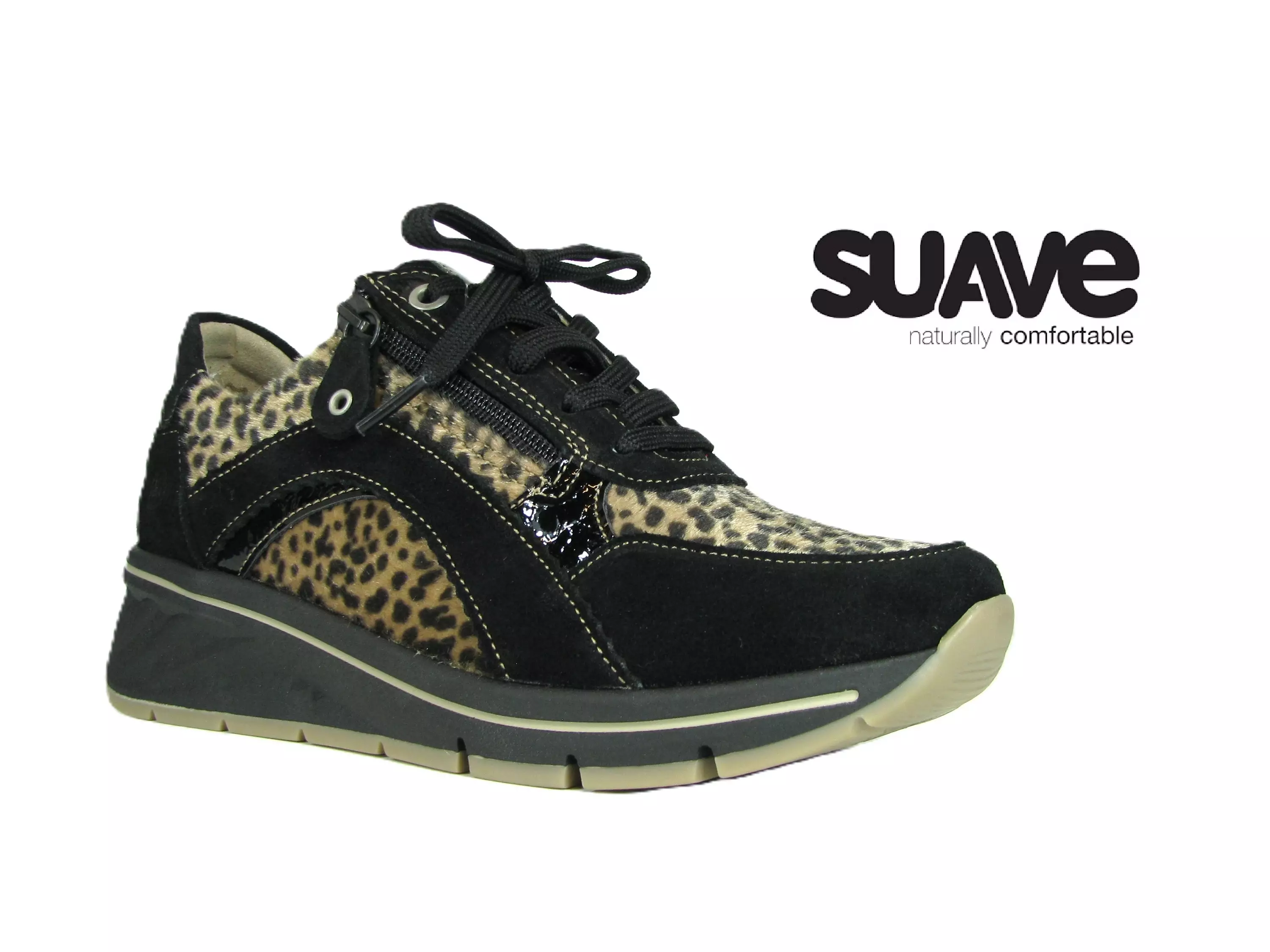 Suaven tilava lenkkarimallin kävelykenkä, jonka päälliosa on valmistettu aidosta ja laadukkaasta nahasta sekä leopardikuvioidusta tekstiilistä. Edessä nauhakiinnitys, jonka avulla kengän saa säädettyä juuri jalkaan sopivaksi. Päällisen ulkosyrjällä vetoketju, jonka avulla kengän saa helpommin puettua jalkaan. Kengän sisäosat ovat kauttaaltaan pohjallisen pintaa myöten miellyttävän pehmeää tekstiiliä, ja irrotettava pohjallinen on hyvin pehmustettu sekä anatomisesti muotoiltu. Air Function- ominaisuus aikaansaa ilman kiertämisen kantapään ja jalkapohjan välillä. Synteettisestä materiaalista valmistettu kuvioitu ulkopohja on joustava mutta tukeva, ja ehkäisee tehokkaasti pohjan luistamista monilla eri pinnoilla. Pohjan korkeus kannassa on n. 4 cm ja päkiän kohdalla n. 2 cm. Näissä kevyissä, antiallergisissa kengissä on huomioitu myös ekologisuus, iskunvaimennus sekä erityisen tilava istuvuus.