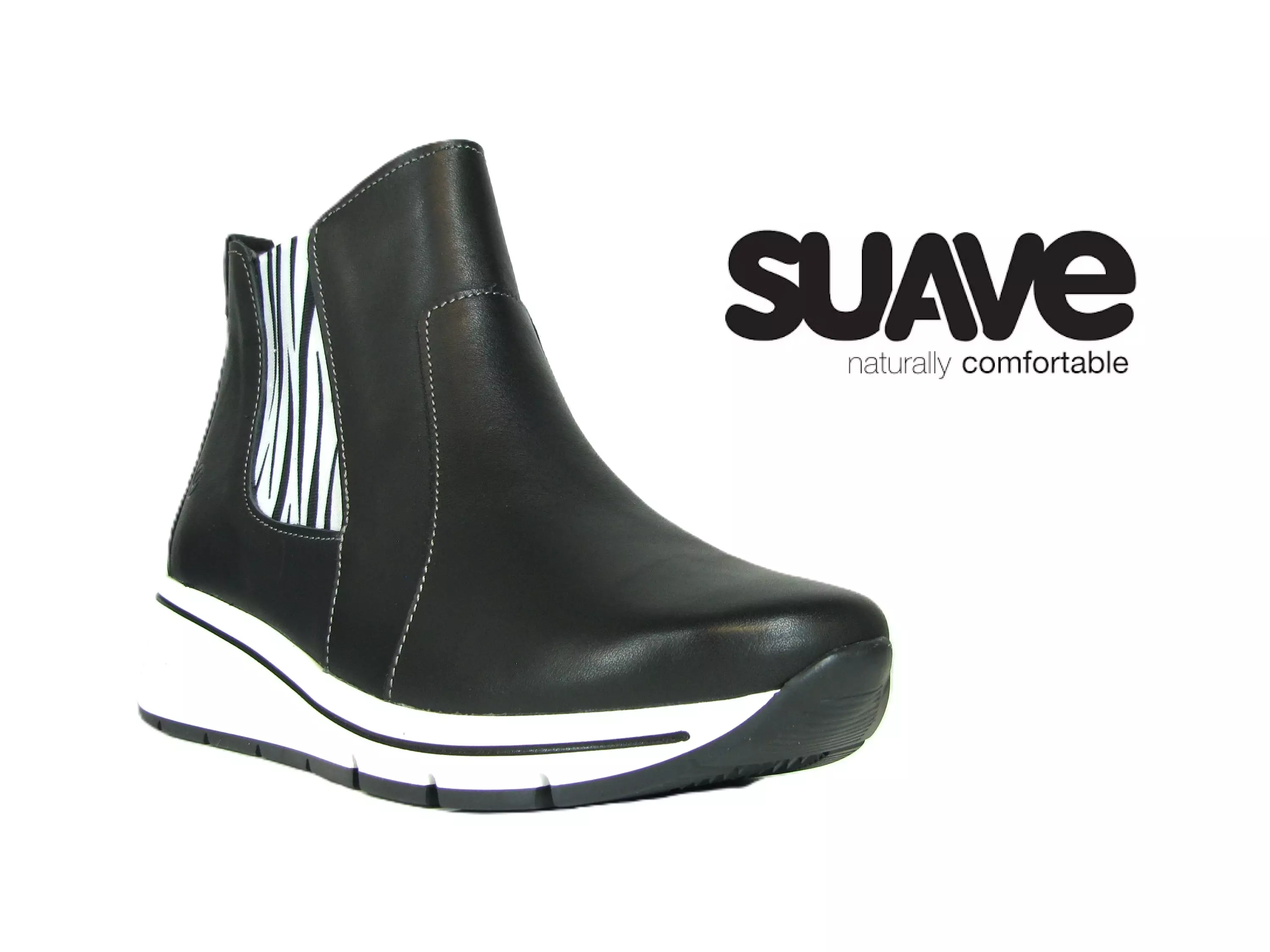 Suaven tilava Bruges-nilkkuri, jonka päälliosa on valmistettu aidosta ja laadukkaasta nahasta. Ulkosyrjällä seeprakuosinen venykepala mahdollistamassa parhaan mahdollisen istuvuuden. Sisäsyrjällä vetoketju, jonka avulla kengän saa helpommin puettua jalkaan. Kengän sisäosat ovat miellyttävän pehmeää ja kevyttä tekstiiliä, ja irrotettava pohjallinen on hyvin pehmustettu sekä anatomisesti muotoiltu. Air Function -ominaisuus aikaansaa ilman kiertämisen kantapään ja jalkapohjan välillä. Synteettisestä materiaalista valmistettu kuvioitu ulkopohja on joustava, mutta samaan aikaan todella tukeva ja ehkäisee tehokkaasti pohjan luistamista monilla eri pinnoilla. Pohjan korkeus kannassa on n. 4,5 cm ja päkiän kohdalla n. 2 cm. Näissä kengissä on erityisen tilavat sisäosat.