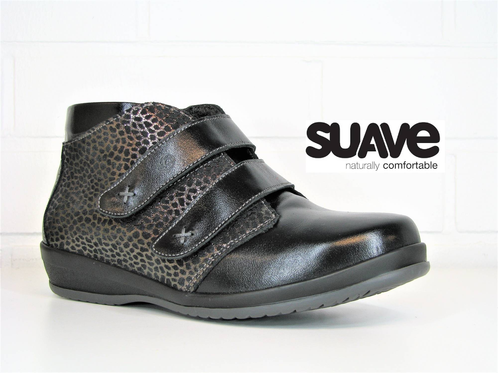Suaven todella reilulestiset ja tilavat korkealaatuiset nilkkurit, joiden päälliosat on valmistettu aidosta ja laadukkaasta nahasta. Päällä kaksi siistiä tarraremmiä tuomassa kenkään laajat säätömahdollisuudet sekä helpottamassa kengän pukemista. Tarrojen avulla kengän suuaukon saa avattua todella laajaksi kenkää puettaessa. Päällistä somistaa kaunis pronssiseen kultaan väriltään taittava kuviointi. Kengässä on irrotettavaa, hyvin muotiltua ja pehmustettua pohjallista myöten ihanan lämmin mutta hengittävä tekstiilivuori. Pohjallisen anatominen muotoilu sekä hengittävyyttä lisäävät ilmareiät lisäävät kengän käyttömukavuutta entisestään. Kengässä on hyvä ilmankierto, sillä sen Air Function-ominaisuuden ansiosta ilma pääsee kiertämään kantapään ja jalkapohjan välillä hyvin. Joustava, taipuisa sekä muotoiltu kumisekoitepohja on pitävä erilaisilla pinnoilla ja ehkäisee tehokkaasti liukastumista. Pohjan korkeus kannassa on n. 2,5cm ja päkiän kohdalla n. 1,5cm.