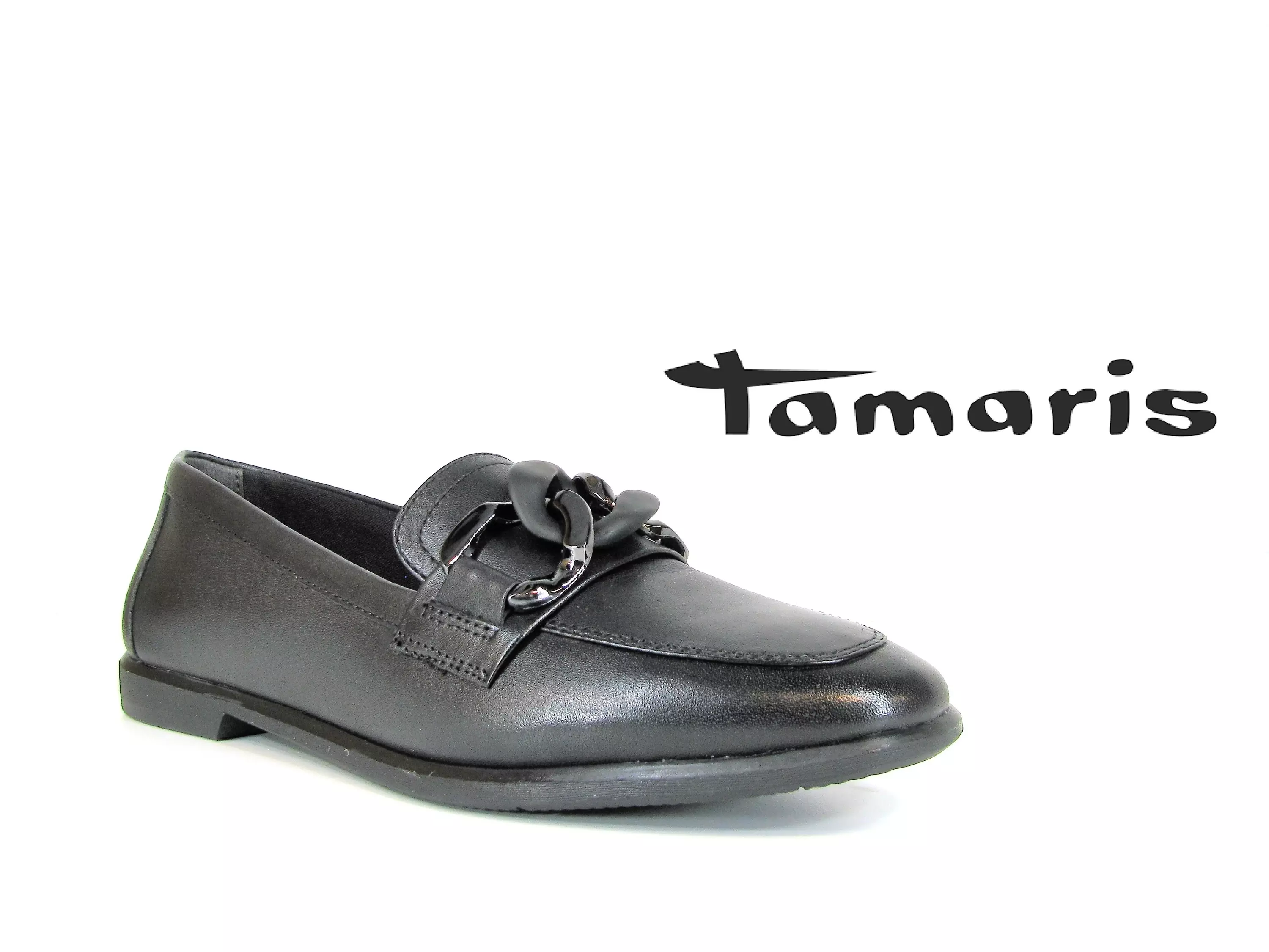 Tamariksen kaunis ja siro loafertyylinen kävelykenkä, jonka päälliosat on valmistettu aidosta ja laadukkkasta nahasta. Edessä kolmilenkkinen yskityiskohta, jonka lenkeistä reunimmaiset ovat sävyltään metallia muistuttavan tummanharmaat ja keskimmäinen pinnaltaan mattainen musta. Kengän sisäosissa on nahkajäljitelmästä valmistettua kannan vahviketta mukavan pehmeä ja ohut tekstiilipinta. Nahkapintainen pohjallinen on hyvin pehmustettu. Siro ja matala Anti Slip-kumisekoitepohja on kuvioitu ja ehkäisee tehokkaasti pohjan luistamista. Kannassa on pieni, matala korko, jonka korkeus on n. 1,5cm.