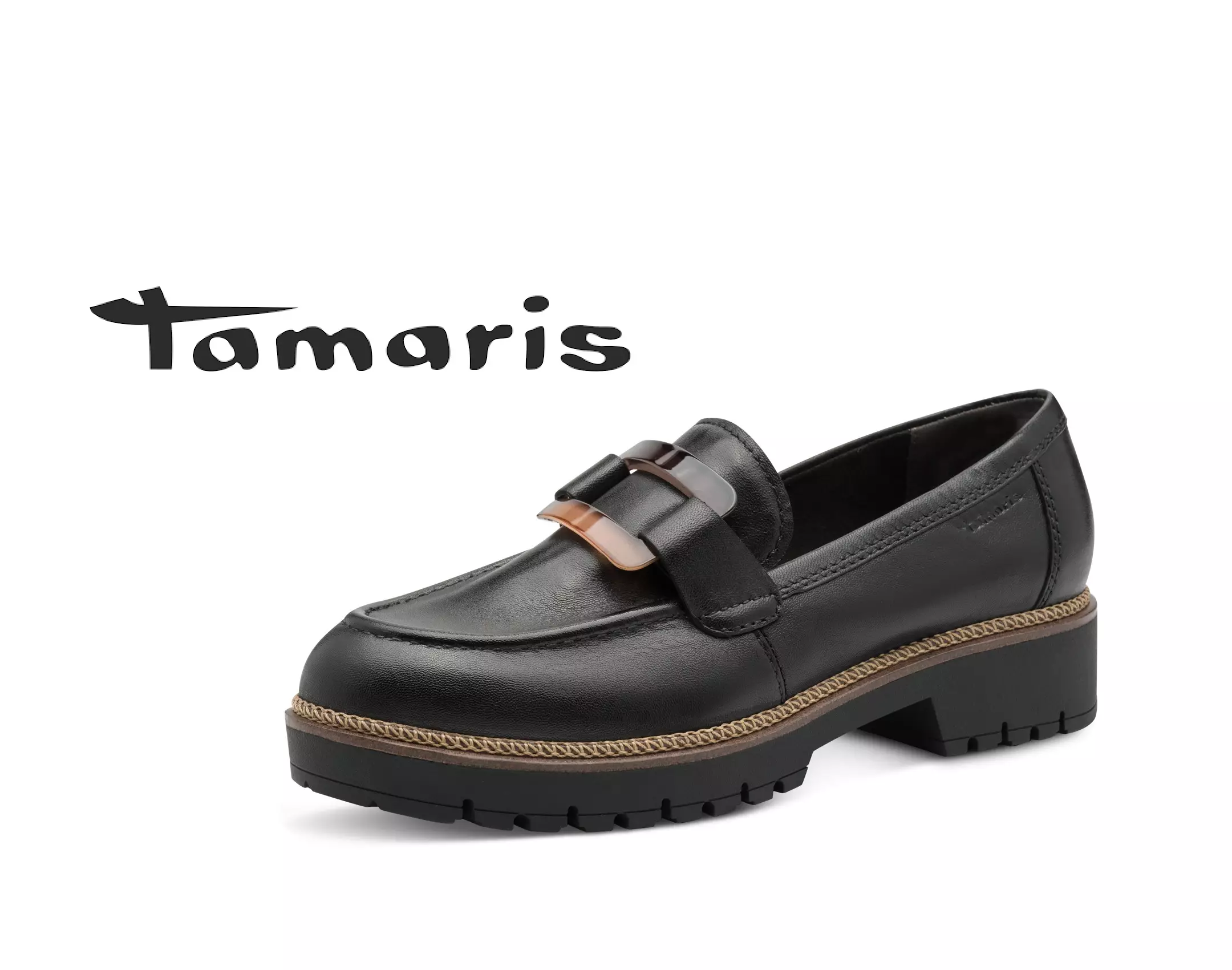 Tamariksen huipputyylikäs loafer, jonka päällinen on valmistettu aidosta ja laadukkkasta nahasta. Edessä suorakaiteen muotoinen yksityiskohta tuomassa kenkään tyylikästä ilmettä. Pohjan ja päällisen välissä kaunis ruskean sävyinen raita ja tikkaus. Kengän sisäosat ovat miellyttävän pehmeää aitoa nahkaa sekä tekstiiliä. Todella hyvin pehmustettu Touch It -pohjallinen sekä pehmustettu kantapala lisäävät kengän käyttömukavuutta. Loaferissa on paksu, kumisekoitteesta valmistettu ja hyvin kuvioitu joustava pohja, jonka korkeus kannassa on n. 4cm ja päkiän kohdalla n. 2cm. Normaali/tilava lesti.