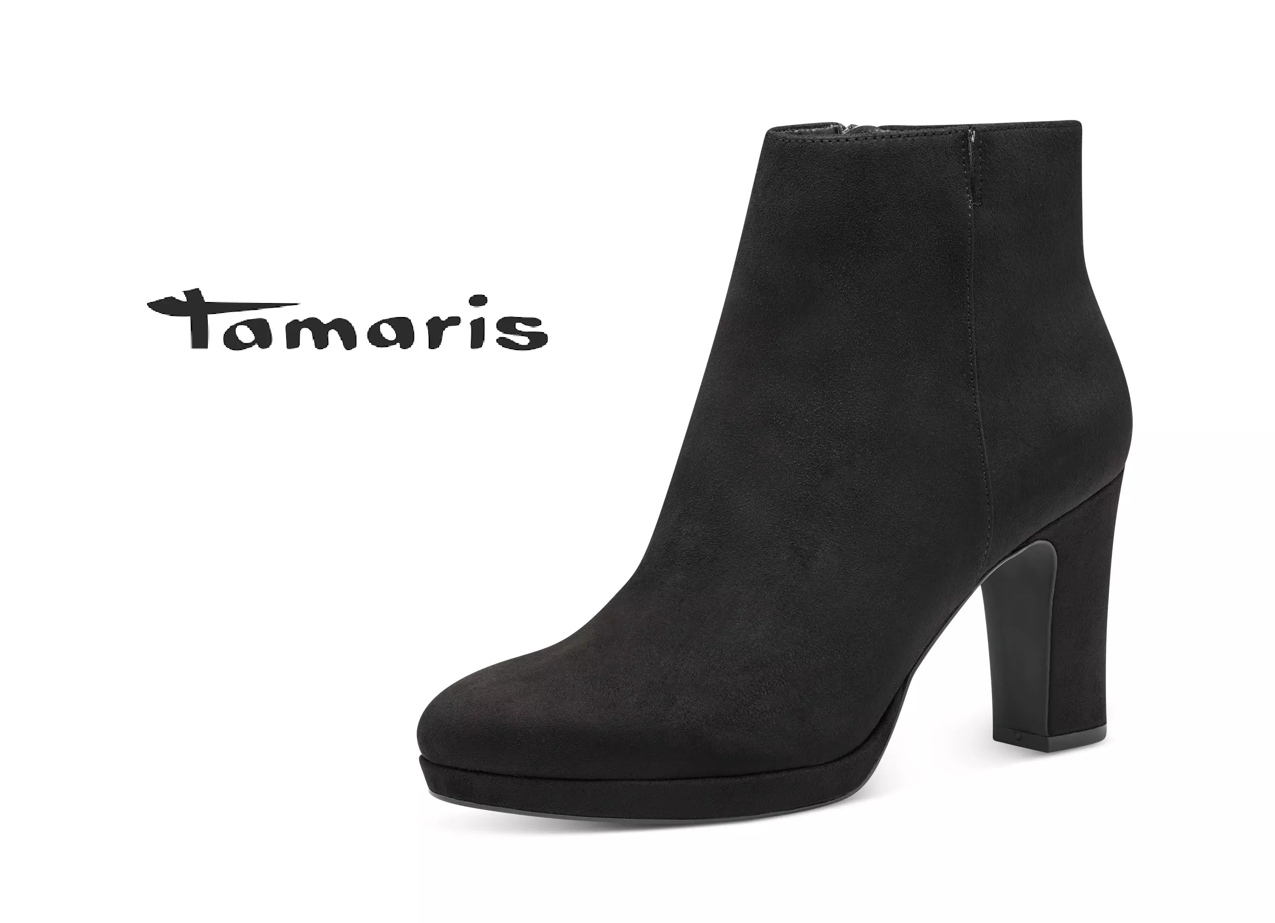 Tamariksen klassiset korkonilkkurit, joiden pinta on valmistettu tekstiilistä. Sisäyrjällä vetoketju helpottamassa pukemista. Sisäosissa on kengän suuaukon sisäosan nahkajäljitelmäreunusta lukuunottamatta kevyt ja pehmeä tekstiilivuori. Touch It -pohjallinen on hyvin pehmustettu. Tukevan koron korkeus on n. 9 cm. Normaali lesti.