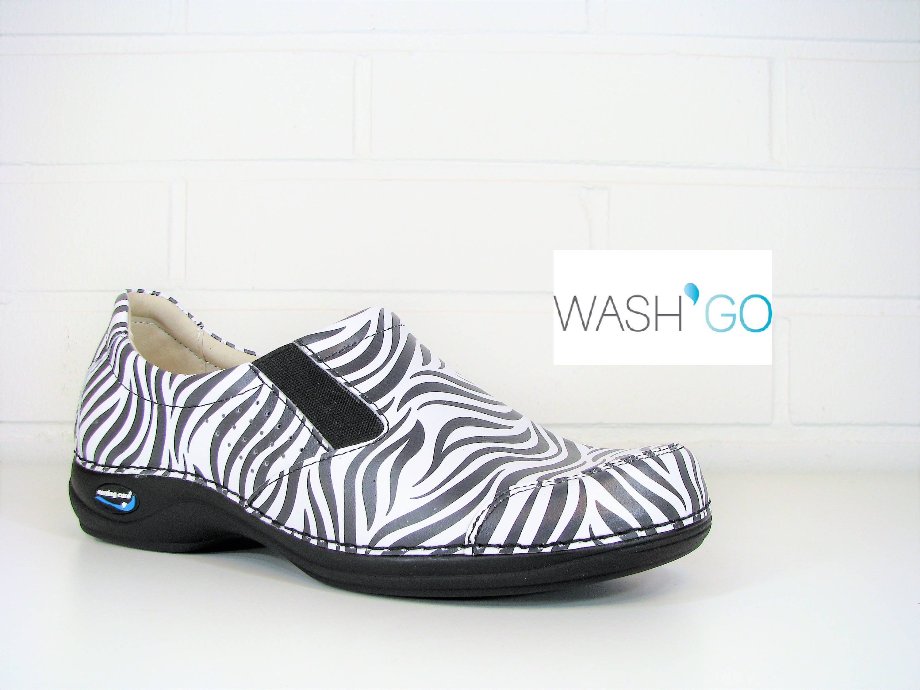 Wash&Go Nursing Care työkengät, jotka on valmistettu aidosta ja laadukkaasta nahasta. Etuosan molemmin puolin joustinosiot tuomassa jalkapöydän päälle tarvittaessa lisätilaa sekä helpottamassa kengän pukemista jalkaan. Nahan rei'itys lisää kengän hengittävyyttä. Sisäosat nahkaa sekä tekstiiliä. Irrotettava pohjallinen on hyvin vaimennettu. Laadukas pohja on CE-merkitty, ja ehkäisee todella tehokkaasti säihköisyyttä sekä liukastumista (antislip-merkitty). Nämä työkengät on valmistrettu Euroopassa, Portugalissa ja soveltuvat erinomaisesti työkengiksi moniin eri työtehtäviin. Väreinä hillitty kokomusta sekä leikittelevä musta valkoinen seeprakuvio. Nämä kengät kestävät myös konepesun (max 30-astetta).