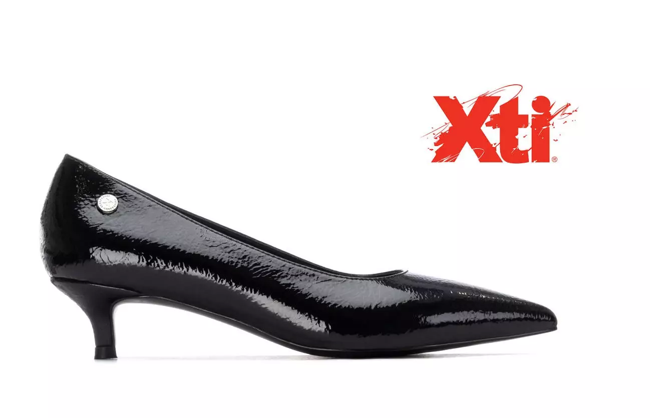 XTI:n siro teräväkärkinen lakeerijuhlakenkä, jonka päällinen on valmistettu laadukkaasta nahkajäljitelmästä. Sisäosat ovat miellyttävän pehmeää nahkajäljitelmää. Siron koron korkeus on n. 4 cm. Normaali lesti.