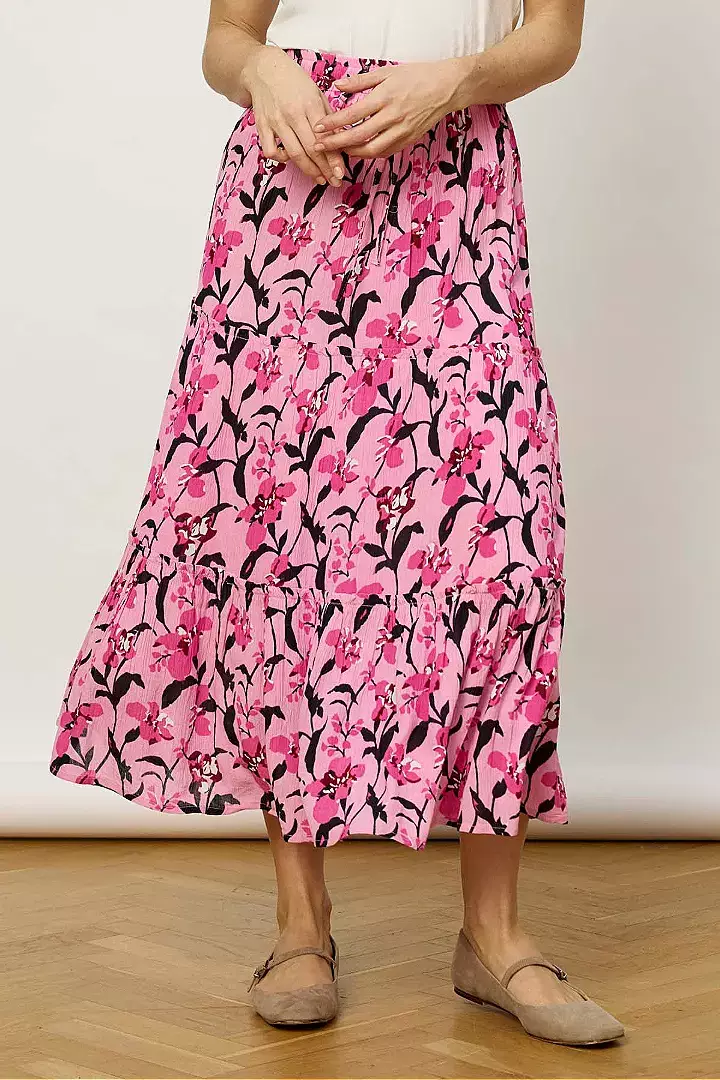 Ze-zen kevyt Ilona 20 hame, jossa kaunis kukkakuviointi. Joustavalla vyötäröllä siro solmittava nauha. Helmassa kauniit poikittaiset leikkaukset.
