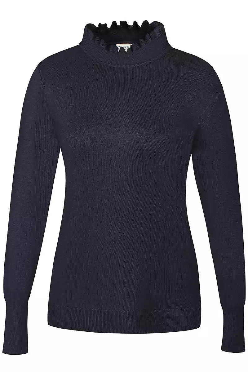 Ze-zen kaunis ja ohuehko Norma 167 neule, jonka korkeassa pyöreässä pääntiessä kaunis lainehtiva rypytys. Täyspitkien hihojen suissa sekä helmassa siistit resorit.