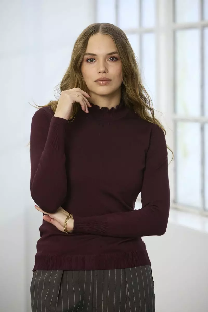 Ze-zen kaunis ja ohuehko Norma 167 neule, jonka korkeassa pyöreässä pääntiessä kaunis lainehtiva rypytys. Täyspitkien hihojen suissa sekä helmassa siistit resorit.