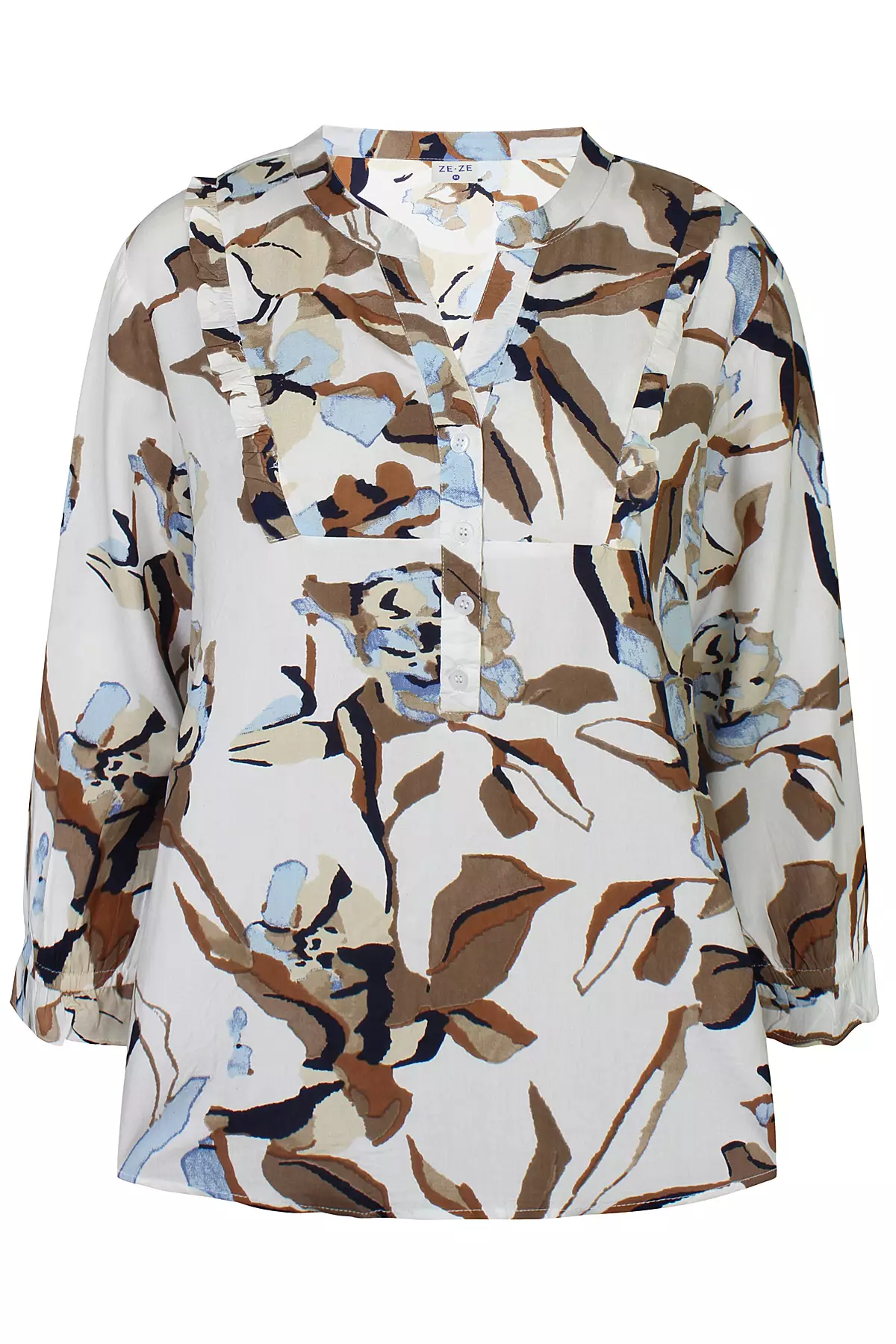 Ze-zen Dot 075 paita, jossa kaunis graafinen kukkakuosi. Sivuilta pyöreän pääntien keskellä v-mallinen muotoilu, jonka alla lyhyt nappilista. Etuosassa sekä 3/4 mittaisten hihojen suissa rypytykset.