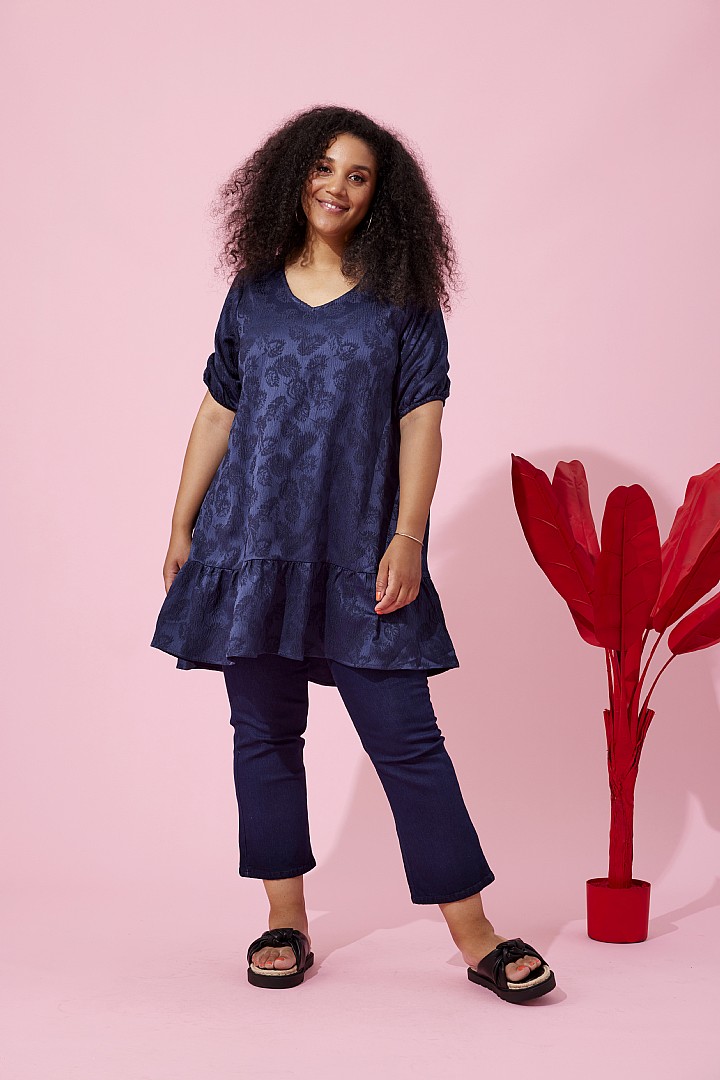 Zhenzi lyhythihainen Trixi 248 tunika. Pääntiessä kaunis kevyesti V-muotoinen leikkus. Pallomaisten hihojen reunassa sirokuminauha.