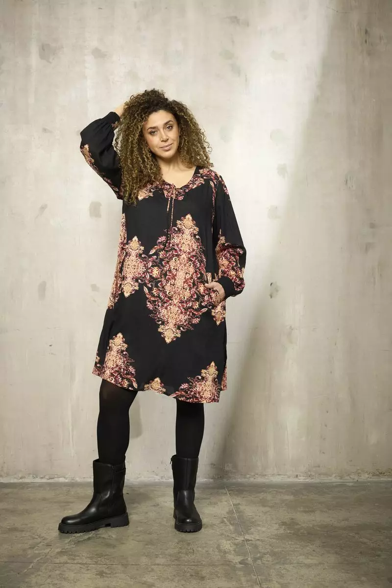 Zhenzin Sila 1052 mekko, jossa kaunis graafinen punaisen ja oranssin sävyissä liukuva kuosi. V-mallin pääntien keskellä siro solmittava nauha. Täyspitkien hieman pallomiasten hihojen suissa kauniit smokkirypytysmäiset resorit. Helman molemmilla sivuilla halkiot. Molemmilla sivuilla taskut.