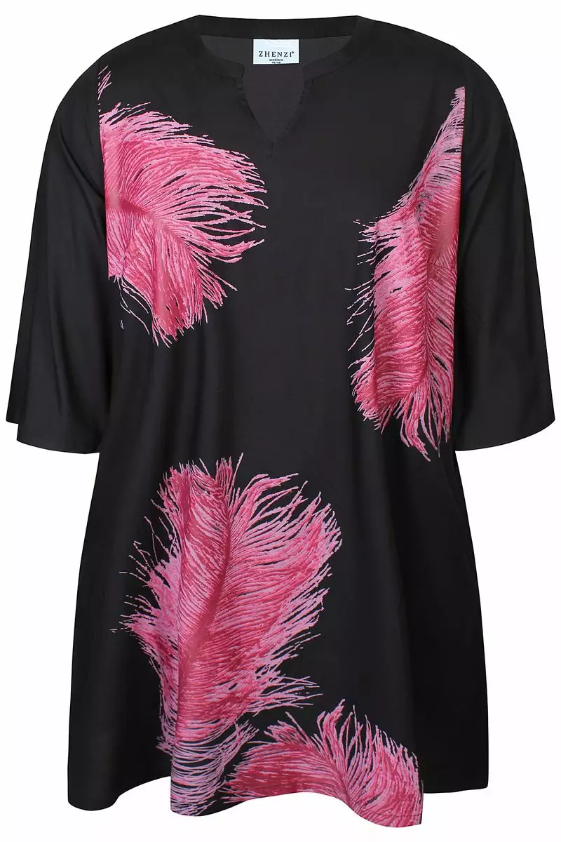 Zhenzin Vada 1127 tunika, jossa kauniit fuksianpunaiset höyhenkuviot. Sivuilta pyöreän pääntien keskellä v-mallin syvennys. Tunikassa on puolipitkät hihat sekä molemilla sivuilla taskut. Helman molemmilla sivuilla halkiot.