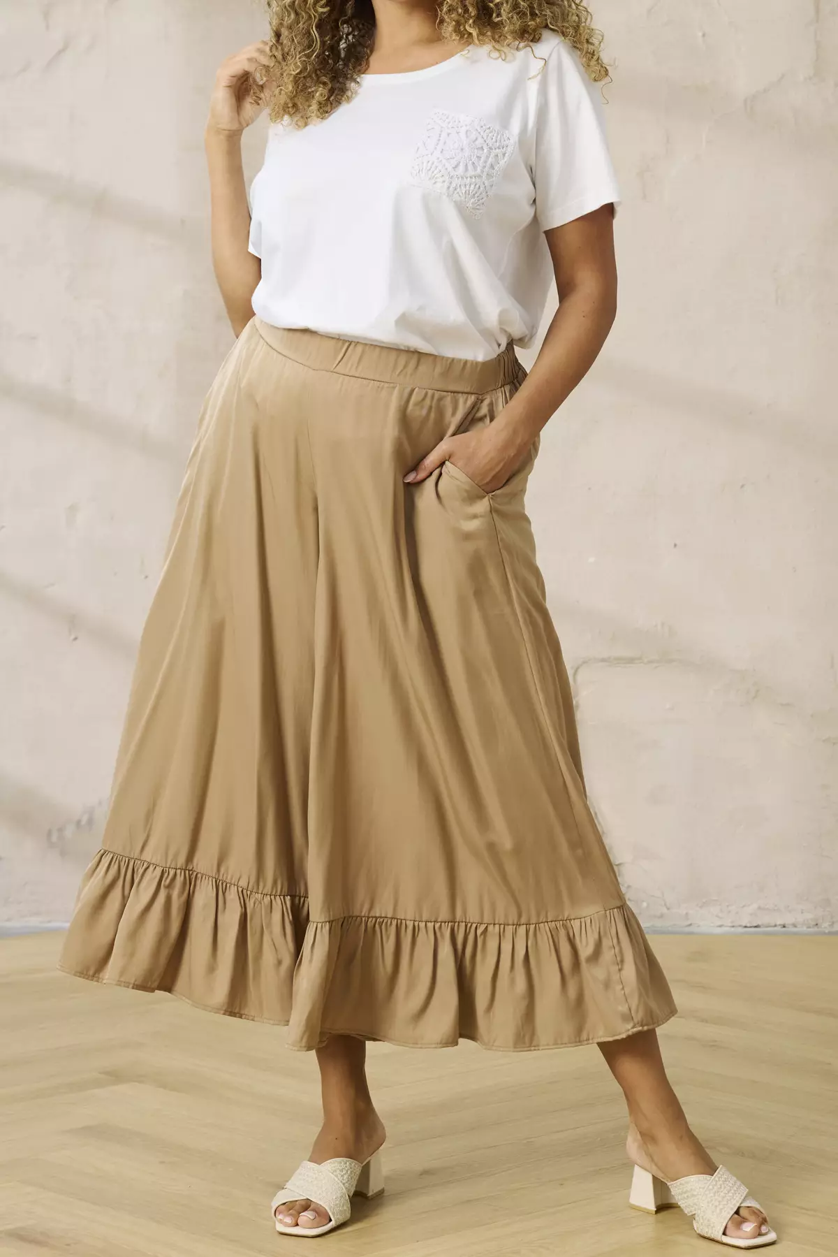 Zhenzin Fiona 1300 housuhame, jossa upeat leveät hamemaiset lahkeet. Takaa joustava vyötrö Molemmilla sivuilla taskut.
