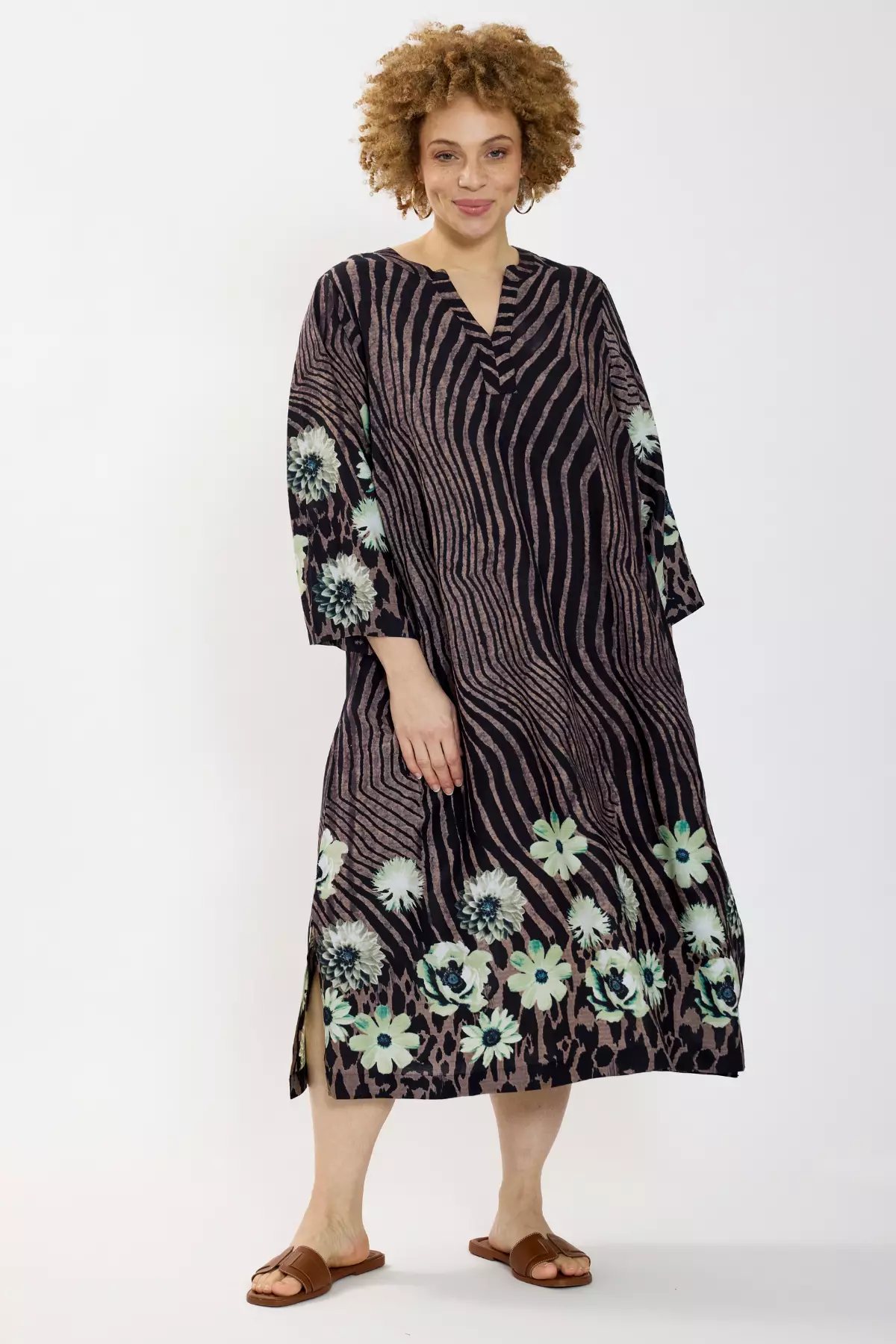 Zhenzin Madge 1572 mekko, jossa kaunis seeprakuosin ja kukkakuvioiden yhdistelmä. Sivuilta pyöreä pääntie laskeutuu keskeltä v-malliin. Puolipitkät hihat. Molemmilla sivuilla taskut. Helman... Lue lisää