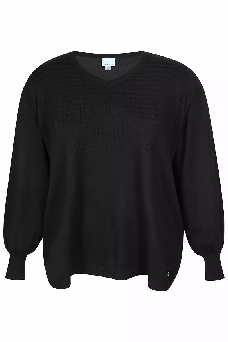 Zhenzin Kogle 994 neule, jossa kauniit pyöreänmalliset täysmittaiset hihat. Hihojen suissa sekä helmassa resorit. Loivasti v-malliin laskeva pääntien. Yläosassa kaunista ruutumaista kohokuviointia.
