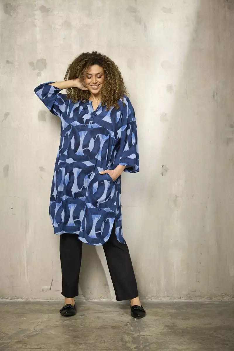Zhenzin Sini 1059 mekko, jossa 3/4 mittaiset hihat. Sivuilta pyöreän pääntien keskellä v-mallinen syvennys, jonka alla kolme nappia. Materiaalina 100 % viskoosi. Kestää 30-asteisen konepesun.... Lue lisää